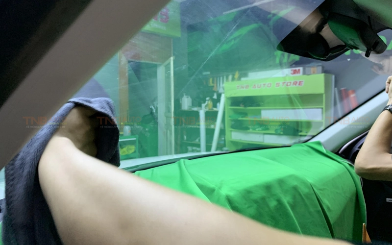 Kỹ thuật viên tiến hành vệ sinh toàn bộ bề mặt kính trong và ngoài bằng dung dịch chuyên dụng. Nếu xe đã từng dán phim trước đó, lớp phim cũ sẽ được lột bỏ, ủ keo để đảm bảo mặt kính sạch hoàn toàn sẵn sàng cho quá trình dán mới.