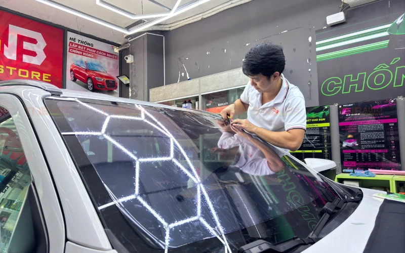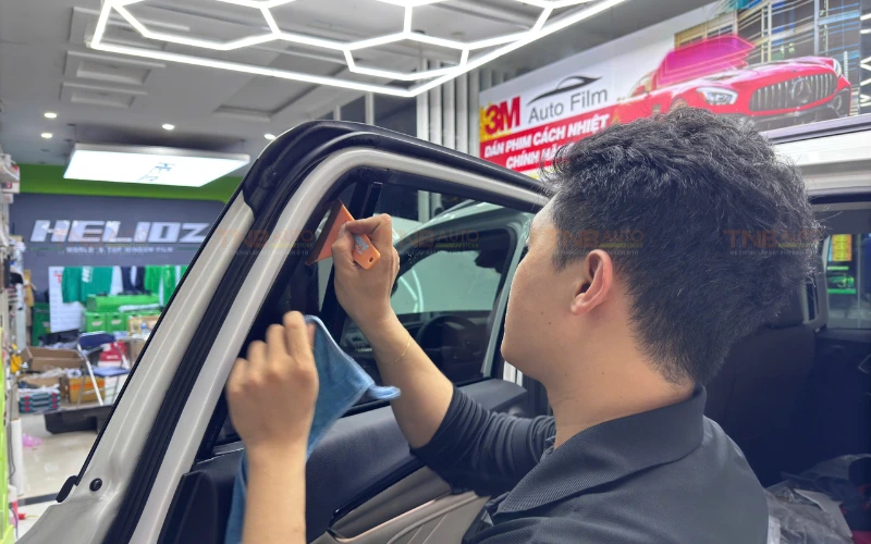 Quá trình thi công được thực hiện cẩn thận nhằm đảm bảo phim ôm sát mép kính, bề mặt phẳng mịn, không nhăn, không bong mép, mang lại tính thẩm mỹ cao cho toàn bộ xe.