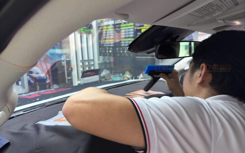Lưu ý: Đối với các vị trí kính có độ cong lớn như kính lái và kính hậu, kỹ thuật viên sẽ sử dụng máy sấy chuyên dụng để gia nhiệt và tạo form giúp phim ôm sát bề mặt kính trước khi tiến hành dán cố định đảm bảo độ bám và độ bền lâu dài.