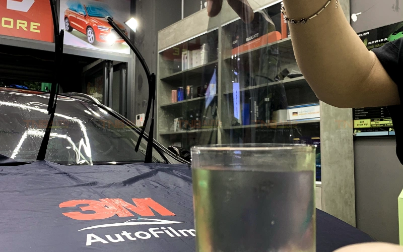Toàn bộ kính xe được rửa sạch bằng dung dịch chuyên dụng, loại bỏ hoàn toàn bụi bẩn, nhựa đường, vết ố hoặc dầu mỡ. Bước này rất quan trọng vì chỉ cần một hạt bụi nhỏ cũng có thể khiến phim bị phồng rộp hoặc xuất hiện bọt khí sau khi dán.