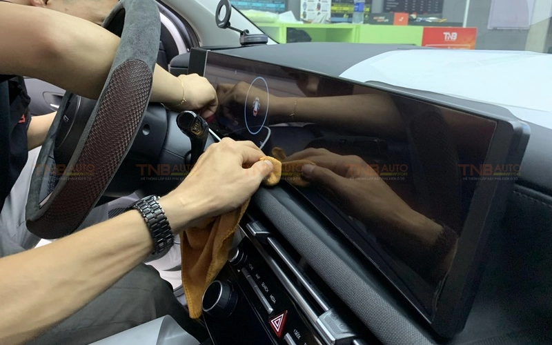 Trong quá trình dán, kỹ thuật viên thường sử dụng nước để điều chỉnh và căn chỉnh phim chính xác. Tuy nhiên, lượng nước này cần được kiểm soát chặt chẽ, không để thấm vào các chi tiết điện tử như bảng điều khiển hay màn hình cảm ứng tránh rủi ro hỏng hóc hoặc ngắn mạch. Việc dán cẩn thận, đảm bảo các thiết bị nhạy cảm không bị ảnh hưởng, sẽ giúp bảo vệ các thiết bị điện tử và đảm bảo chúng hoạt động ổn định lâu dài.